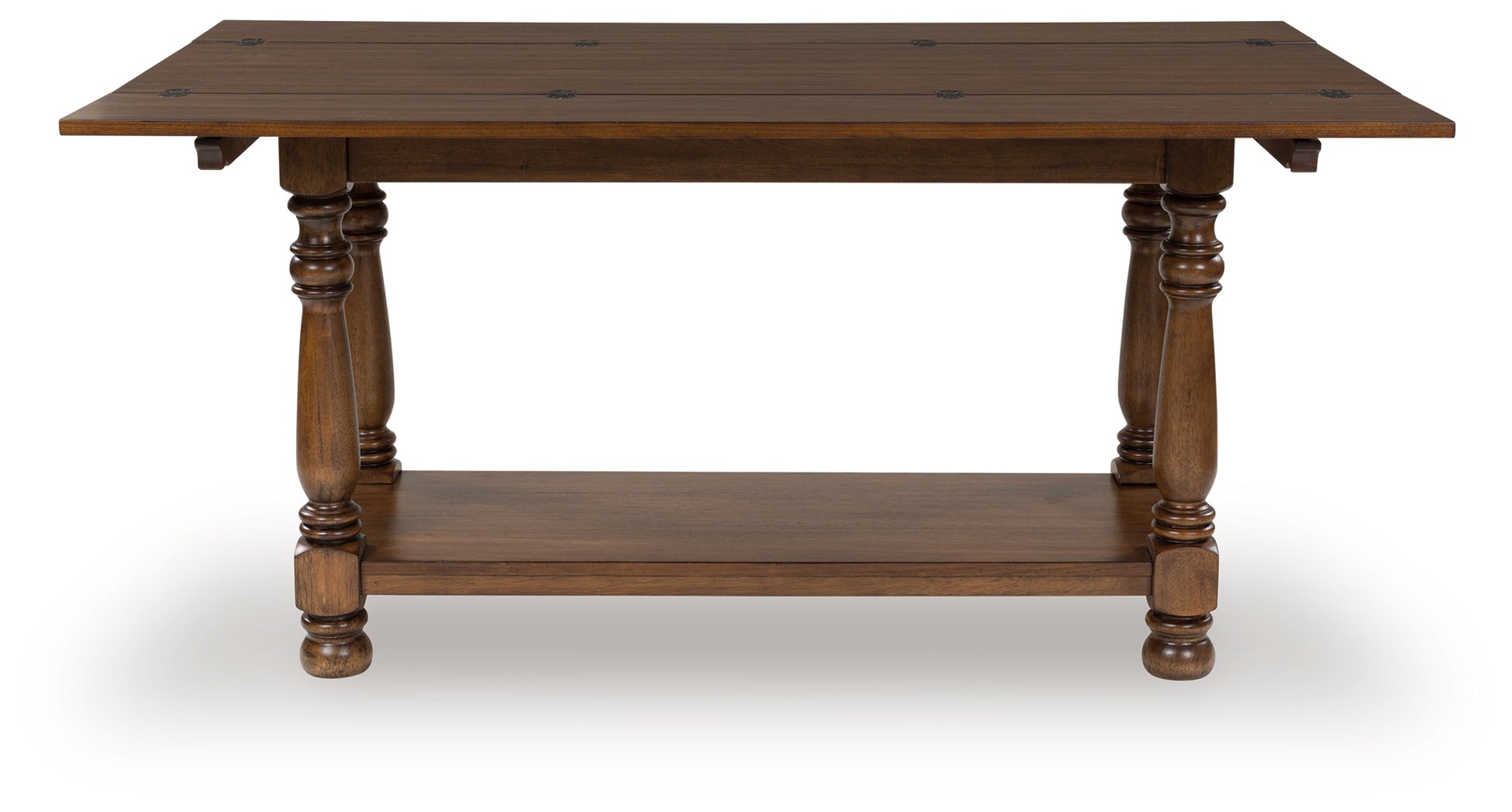 Traditional style doesn’t have to be stuffy. It can feel warm, inviting and beautifully in the moment. Case in point: this flip-top sofa table. Showcasing uniquely detailed leg posts, it has an allure all its own. Equally special is the rich brown finish, which exudes a mood of timeless charm. And when you need an extra dining space, simply fold open the table\'s hinged panels. How\'s that for relaxed refinement?