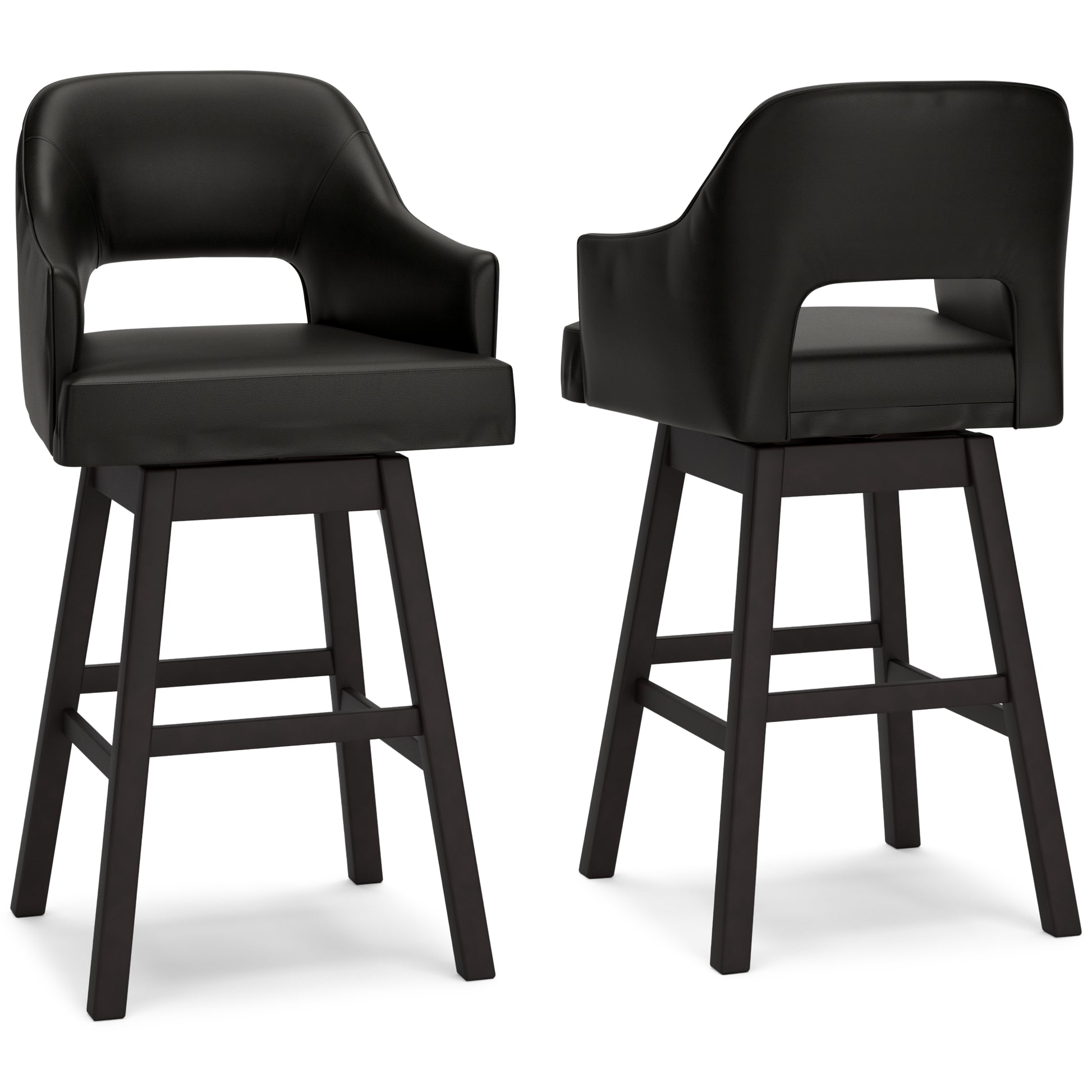 This bar stool package invites you to take contemporary modern style for a spin. Comfortably cushioned seats, self-returning swivel design and contoured backs make this set beautifully in tune with your needs. Luxurious faux leather upholstery is a sensational touch