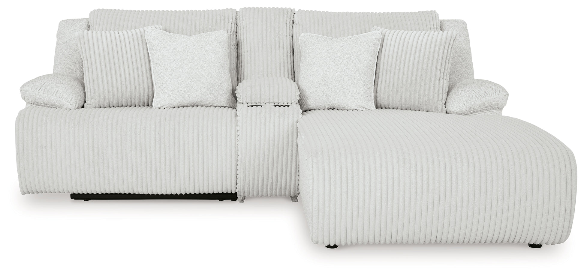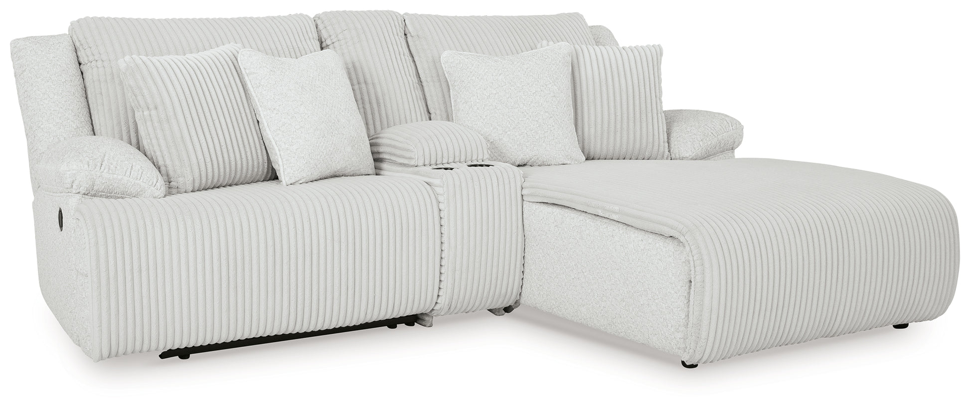 Includes 3 pieces: left-arm facing recliner, console with storage and right-arm facing press-back chaise,