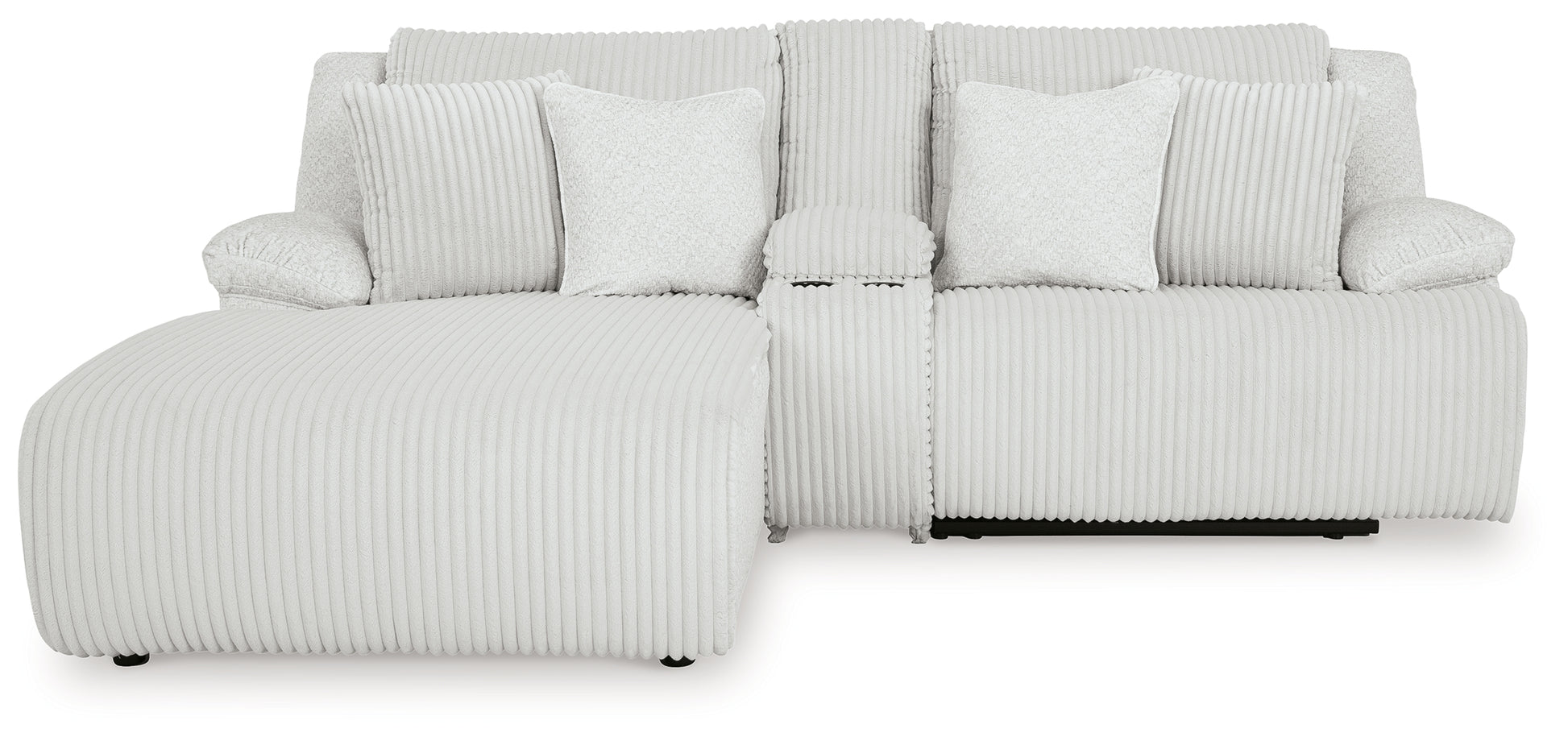 Includes 3 pieces: left-arm facing press back chaise, console with storage and right-arm facing recliner,