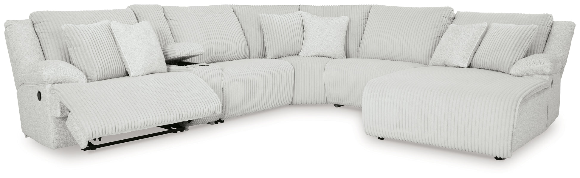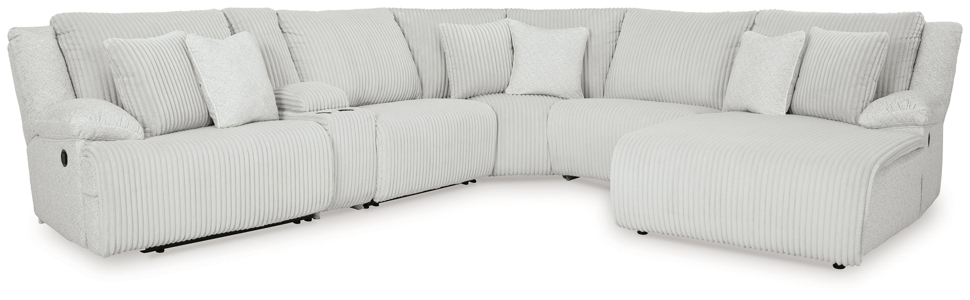 Includes 6 pieces: left-arm facing recliner, armless recliner, armless chair, console with storage, wedge and right-arm facing press-back chaise,