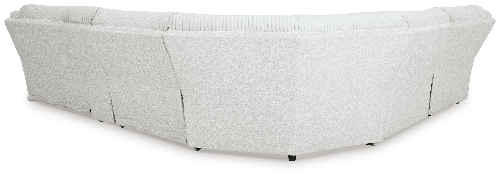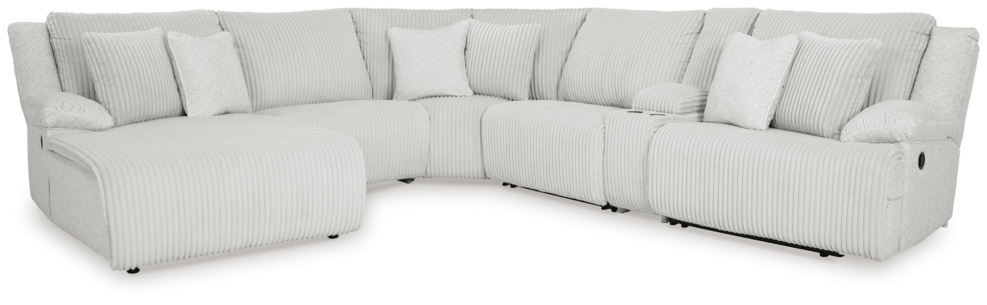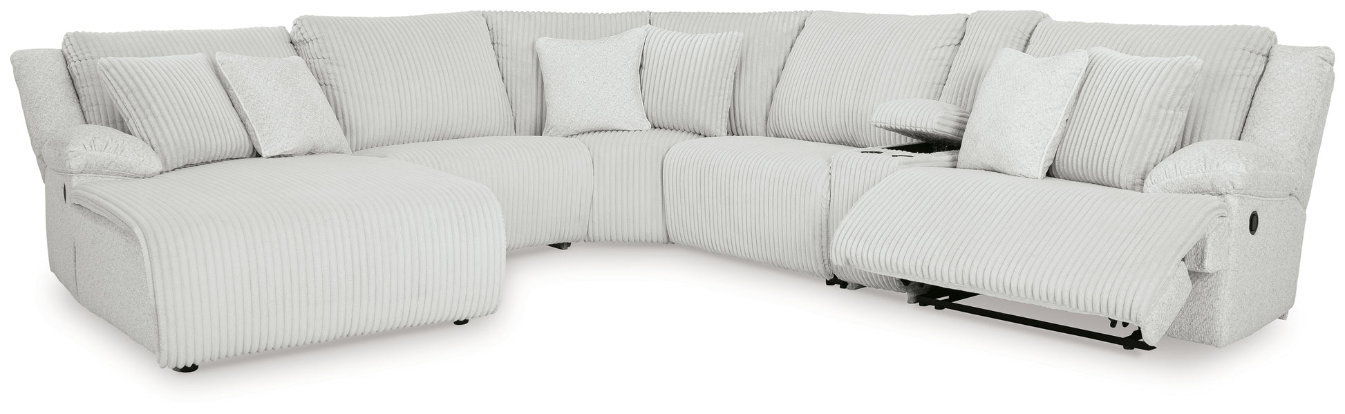 Includes 6 pieces: left-arm facing press back chaise, armless recliner, armless chair, console with storage, wedge and right-arm facing recliner,
