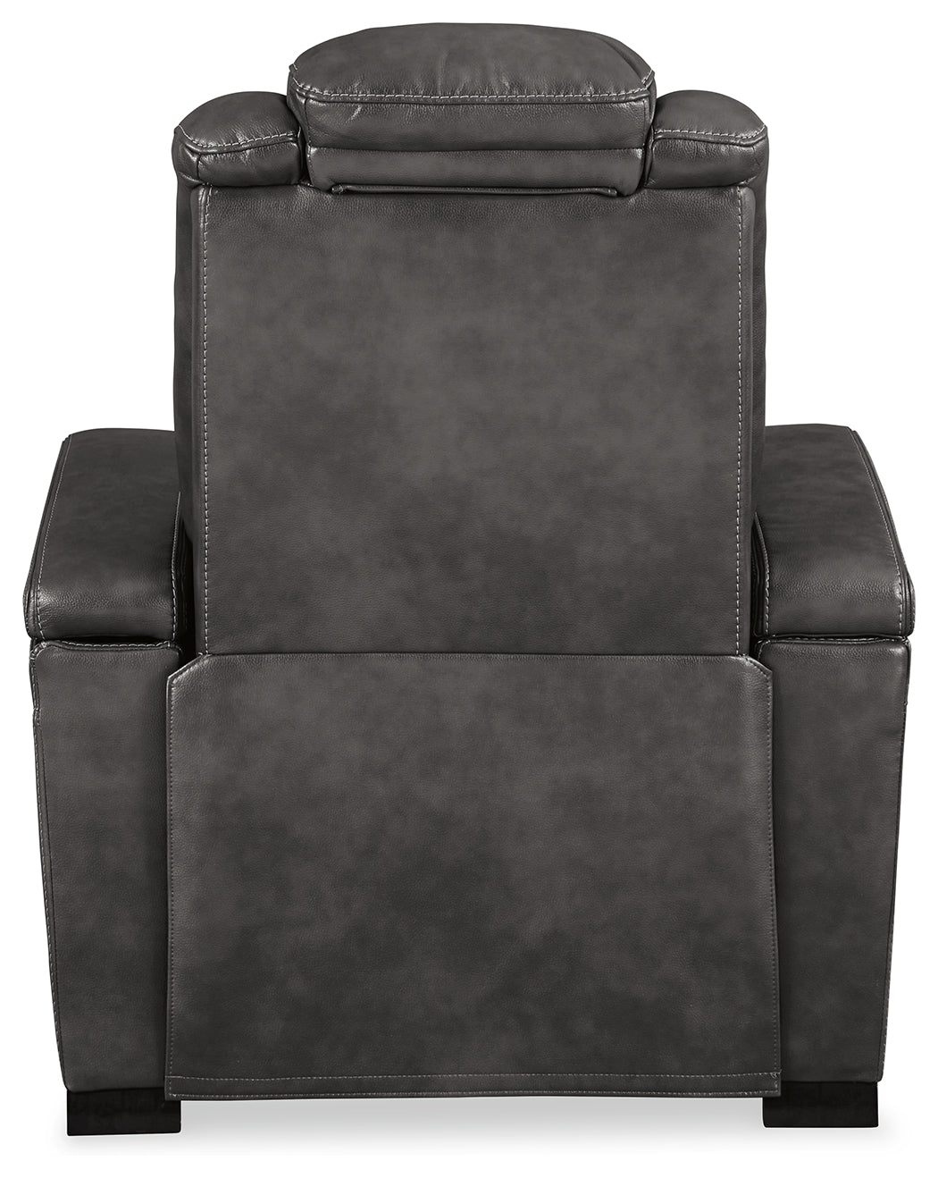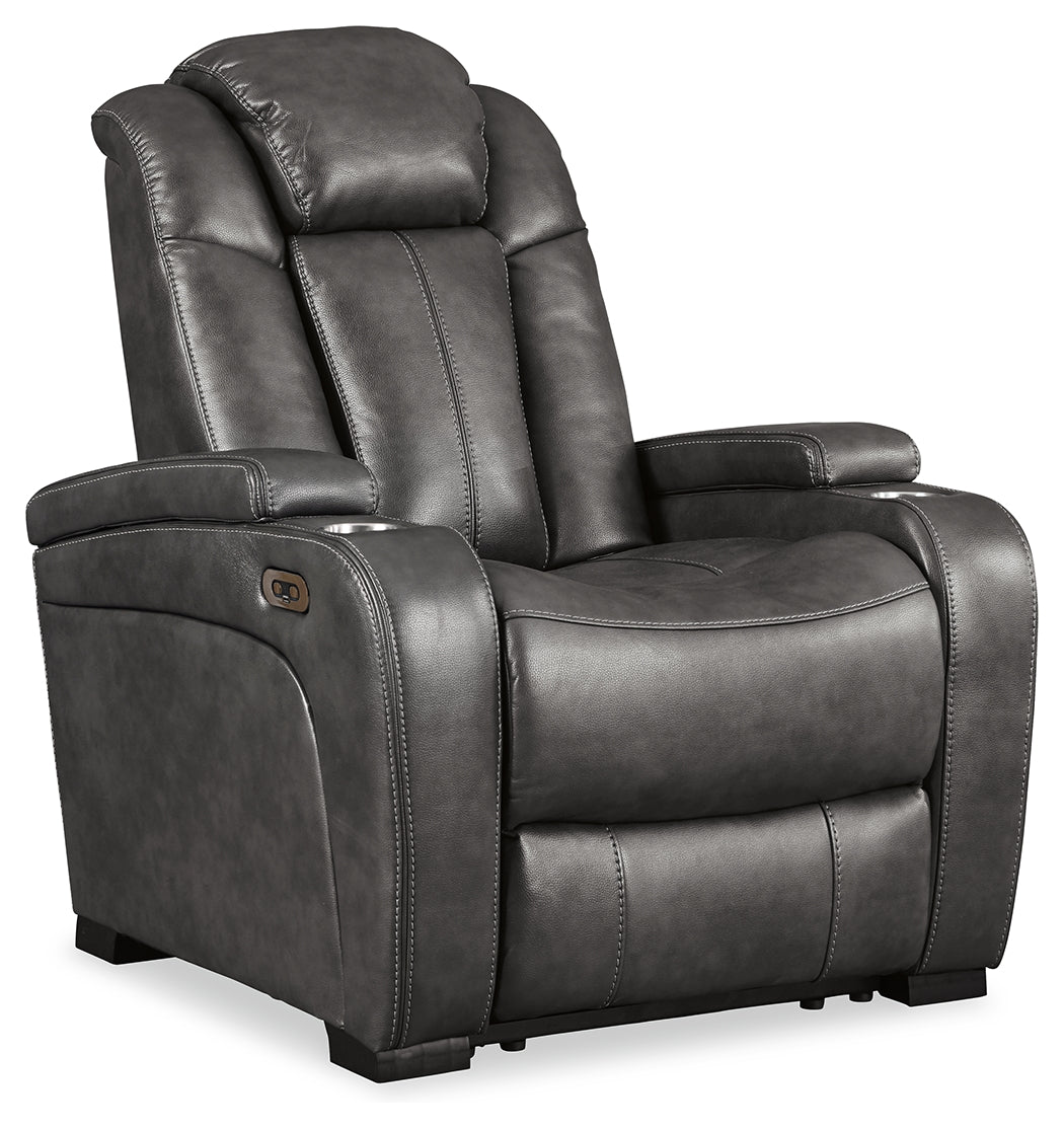 Looking for a seat with all the bells and whistles? This power recliner has you covered. Get double the relaxation as you recline your body and adjust your headrest. With USB charging ports, your devices will enjoy this recliner, too. Stainless steel cup holders accompany you on either side. It\'s all wrapped up in quality faux leather with fashion-forward jumbo stitching, for a look and feel you’ll love.