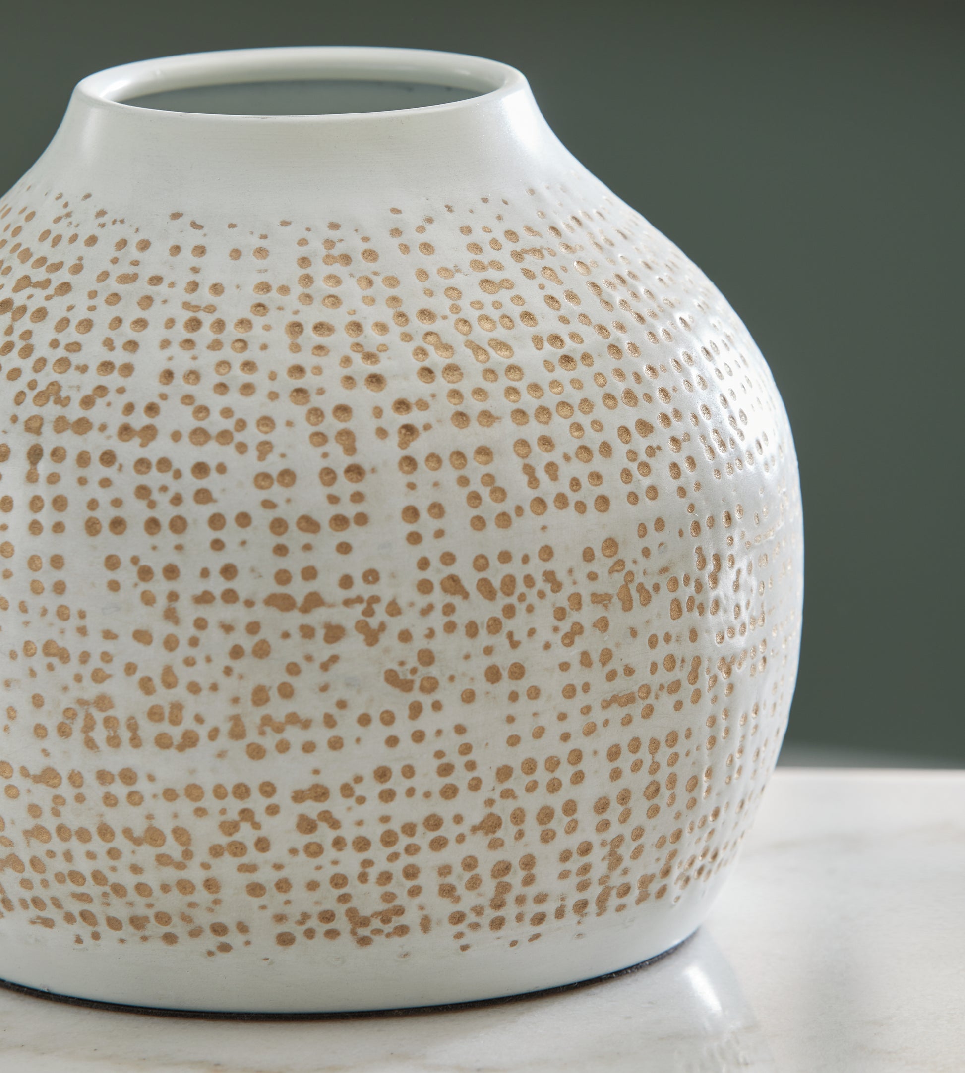 Elevate your decor with this striking accessory set. Its sleek white vases, adorned with delicate goldtone accents, are perfect for displaying your favorite faux blooms or standing alone as minimalist statements. They\'re paired with bold geometric sculptures, creating a dynamic and sophisticated look for modern spaces.
