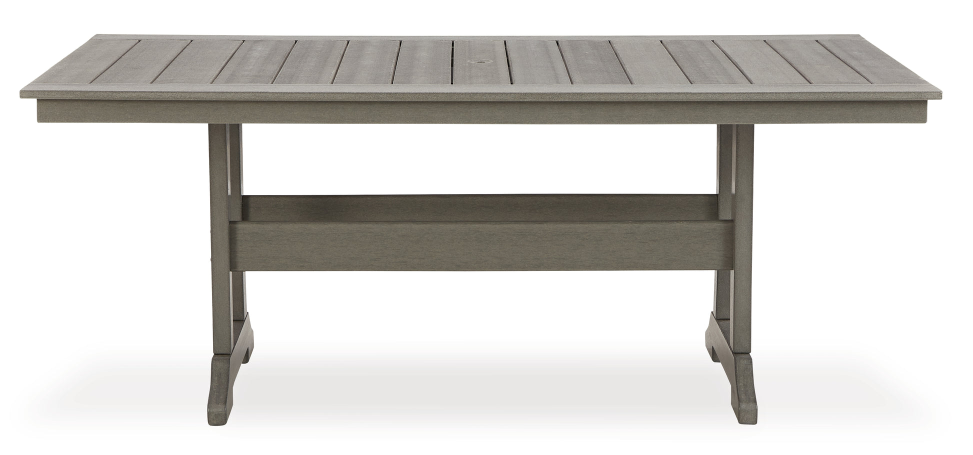 It’s the dawn of a new day for gray. Embrace the style trend with this outdoor dining set. Each piece is crafted of HDPE material, combining the exceptional durability and weather resistance you need with the \"wood look\" you love. The rectangular table and comfortably cushioned chairs take alfresco living to a whole new level. A slatted table top infuses a plank-style, farmhouse-inspired touch and naturally sheds rainwater. Rest assured, the thick seat and back cushions on the chair are wrapped in Nuvella® high-performance fabric that’s fade-resistant, stain-resistant and a breeze to clean.