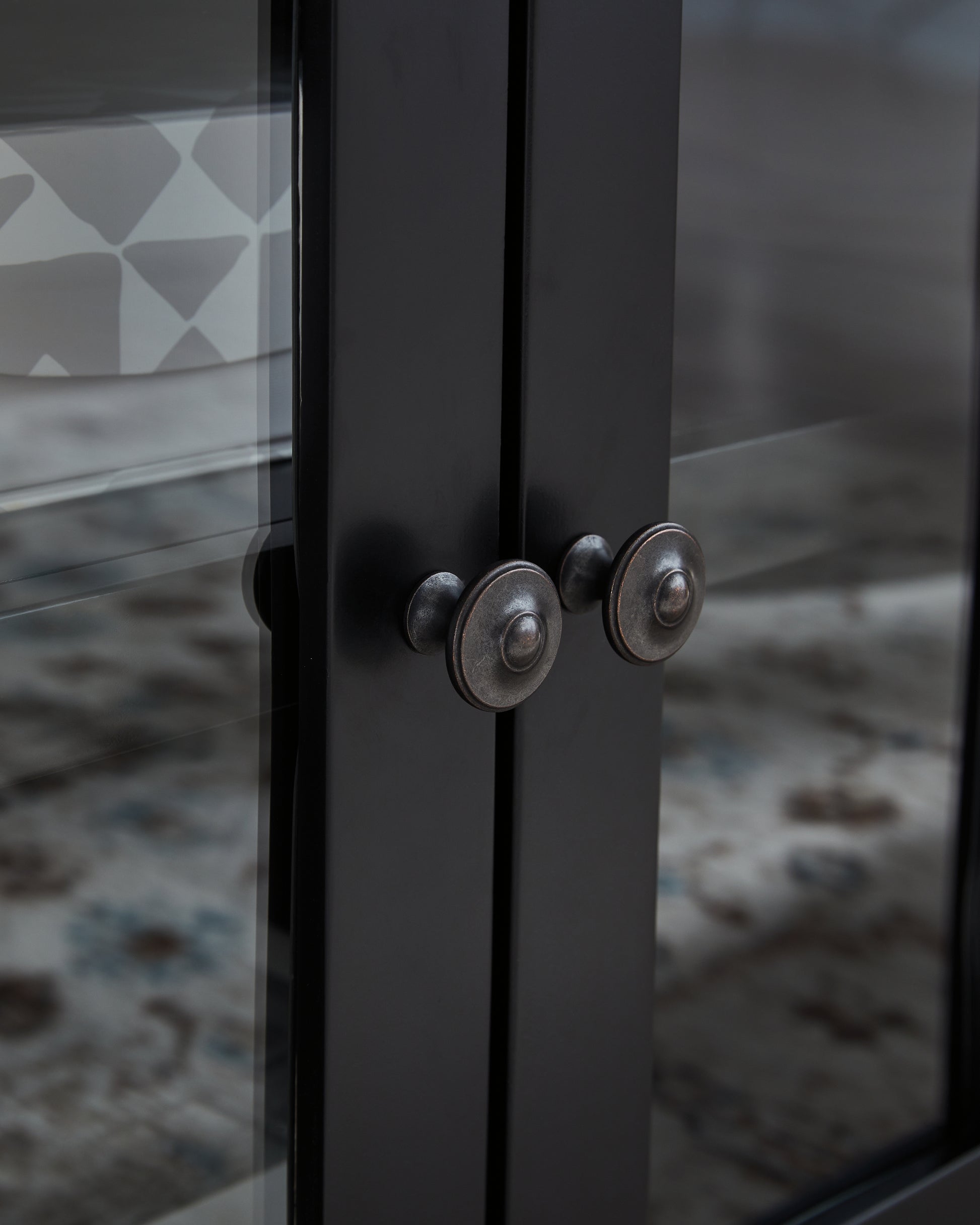 Hardware with dark bronze-tone finish,