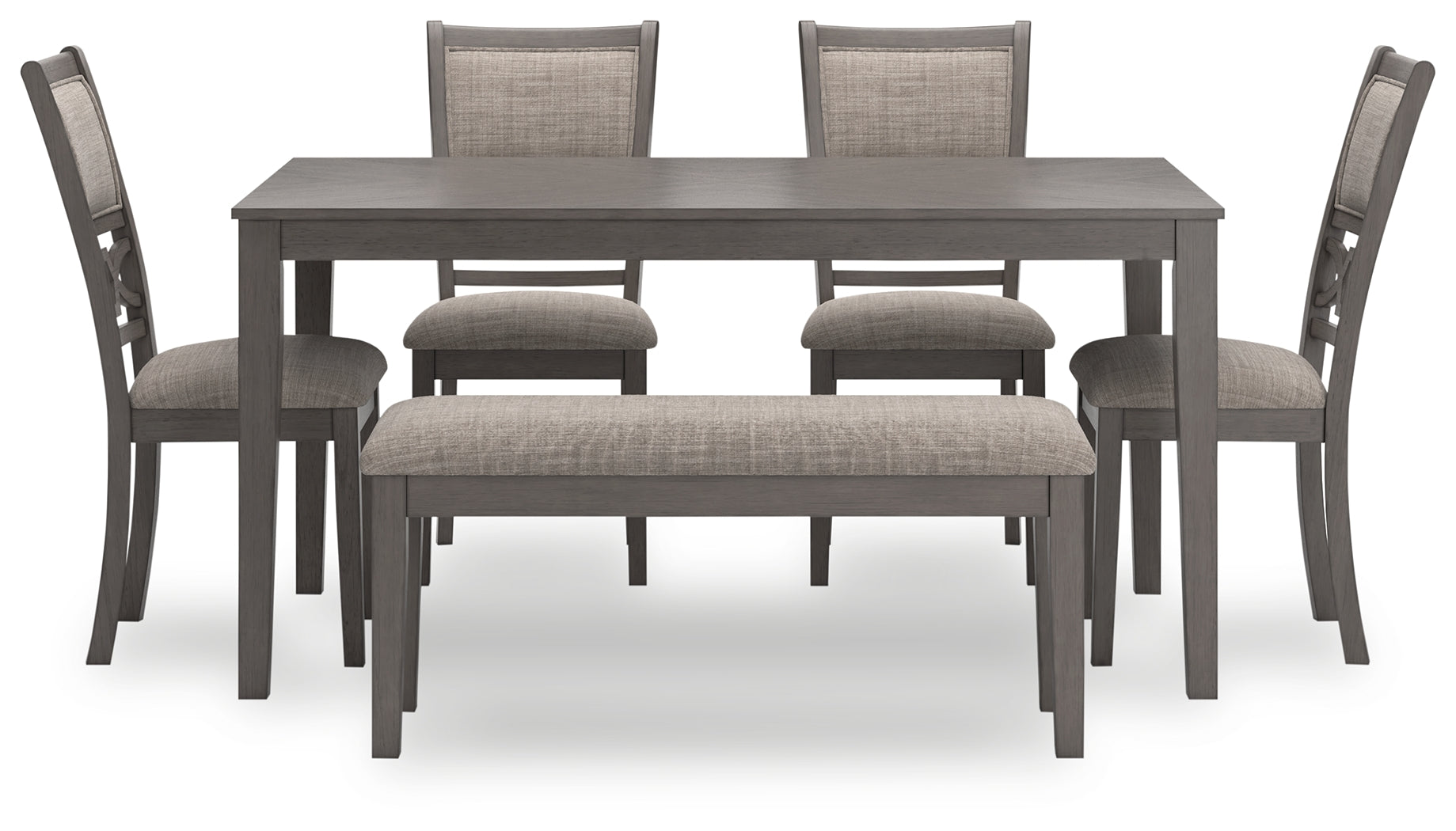 Can’t decide between classic and contemporary? Embrace the beauty of transitional style with this casually sophisticated Langwest dining table, chairs and bench ensemble. A clean-lined profile and modern light gray finish merge with textured upholstery to create a timeless yet on-trend look when guests gather.